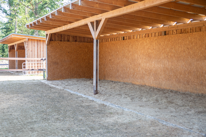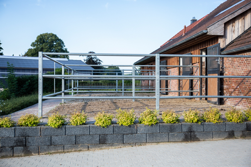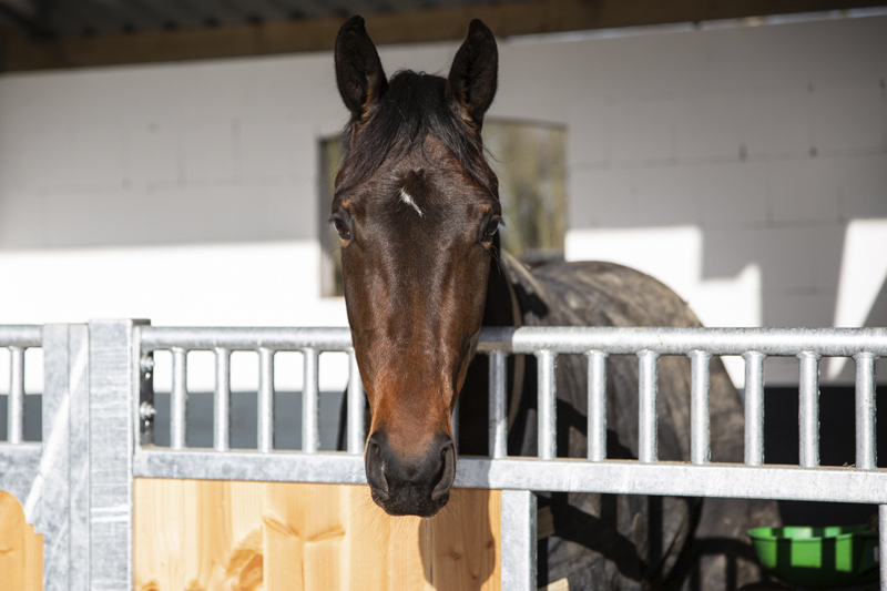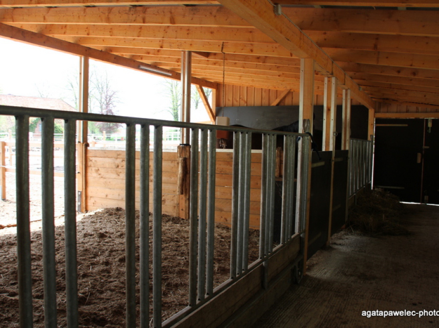 Direkt am Wohnhaus befindet sich ein Stall mit sechs 25m² großen Boxen mit angrenzendem, frei zugänglichem 30m² Paddock. In jeder Box ist eine Heuraufe angebracht, sodass den Pferden Raufutter immer zur freien Verfügung steht. Für genügend Sozialkontakt sorgen die gitterlosen, halbhohen Boxenwände.