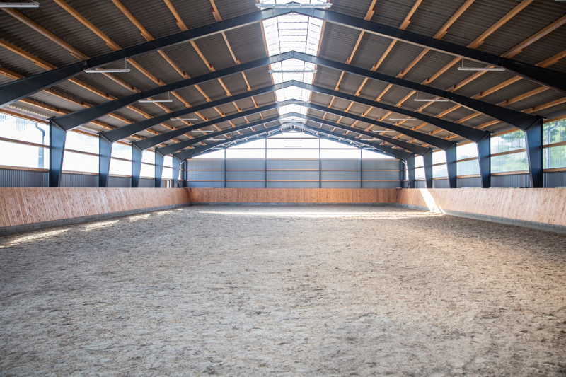 Die Reithalle, mit den Maßen 20 x 40m, wurde im Herbst 2019 fertiggestellt. Auf einen guten Reitboden wurde selbstverständlich größten Wert gelegt, sodass auch hier wieder „Der grüne Sand“ zum Einsatz kam. Die neue Reithalle verfügt über eine zusätzliche Sattelkammer, weitere Putzplätze und ein Badezimmer mit WC und Dusche.